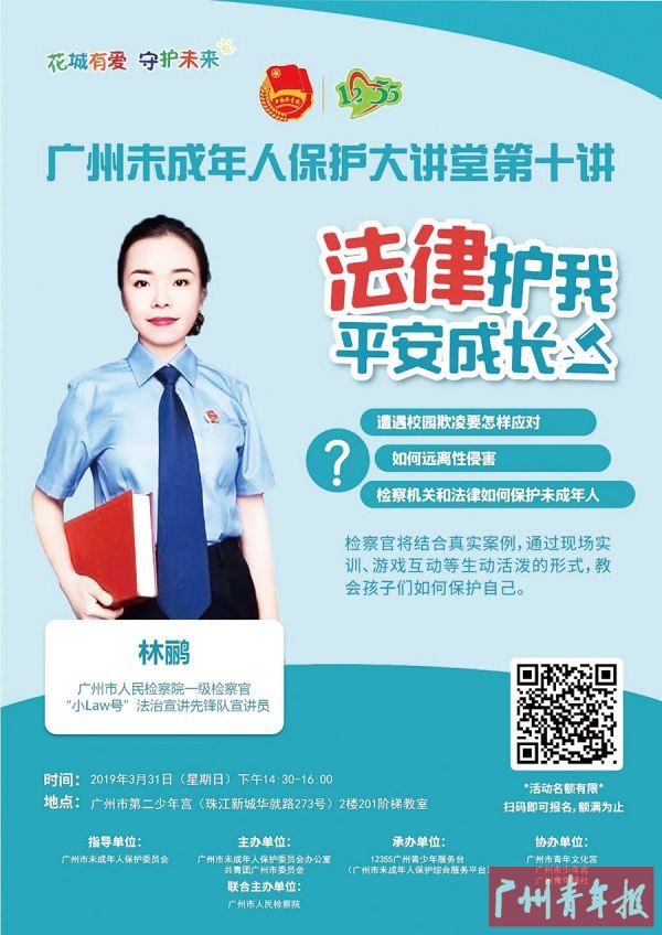 日期:[2019-04-04] 版次:[B04] 版名:[心声热线]遭遇校园欺凌要怎样应对?如何远离性侵害?检察机关和法律如何保护未成年人?上周日(3月31日),广州未成年人保护大讲堂第10讲在市第二少年宫开讲。广州市人民检察院一级检察官、“小Law号”法治宣讲先锋队宣讲员林鹂检察官以“法律护我平安成长”为主题,结合真实案例,通过现场实训、游戏互动等生动活泼的形式,教会同学们如何保护自己。