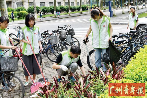 本报讯(记者 胡媛媛 通讯员 官天明 摄影 黄宇帆)为巩固广州市“国家卫生城市”称号,结合2019年度国家卫生城市复审的工作部署,近日,团广州市委发动全市80间志愿驿站上千名志愿者共同开展新时代文明实践十项青年志愿服务专项行动之义务劳动集中行动日活动,组织近百名志愿者整理周边不按规定乱停乱放的共享单车、清理被人随手丢弃的烟头等废弃物、清洗广场附近地面。30间志愿驿站作为本次活动的主会场和示范站,同时开展了卫生环保的宣传活动。其中,越秀区团一大志愿驿站组织志愿者定期前往越秀南汽车客运站摆放来往旅客所停放的共享单车,荔湾区沙面驿站组织志愿者在沙面旅游区拾取烟头及开展控烟宣传,天河区正佳广场西北门志愿驿站还深入周边社区开展垃圾分类宣传活动。“参加义务劳动的志愿者,虽然只为文明城市的创建贡献了绵薄之力,但他们以实际行动影响了周边的市民群众,推动了环保意识的传播,有利于文明观念深入人心,这为国家卫生城市的创建作出了意义重大的贡献”,团一大驿站站长甘永乐说道。