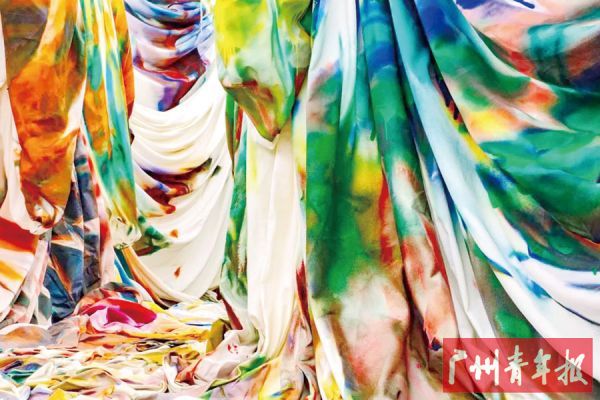 “呢喃的泥土”广州站分为三个展区——《丝绸工作室》、《腹中》、《陈列室》。在格罗斯所建造的空间里,色彩如同强度不一的震颤和视觉声浪,可见与不可见、可知与不可知交织在一起。观众被邀请进入艺术作品之中,沉浸在迷宫般的空间体验中。