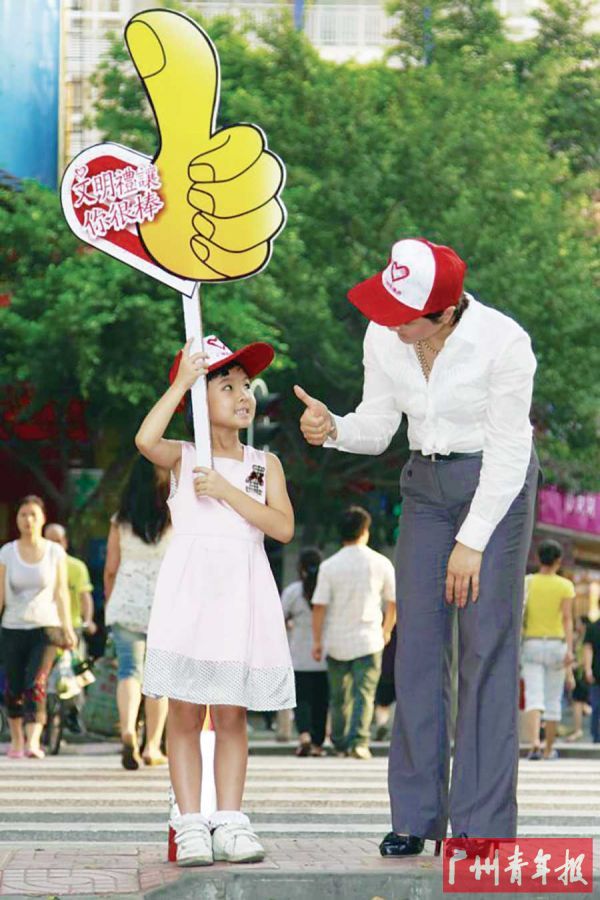 “大拇指”行动的特点是要求志愿者在开展活动时,看见好的现象要竖起“大拇指”标志牌说“文明礼让,你很棒”,看见不好的现象时也竖起“大拇指”标志牌予以善意提醒,把“我去劝”改为“我去夸”。