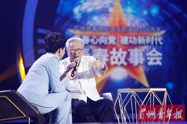 “新时代中国青年要树立远大理想,新时代中国青年要热爱伟大祖国。”青春故事会“理想•爱国”部分,地铁检修员、歌剧创作者、法医、创业者、扶贫干部、空姐等各行各业的青年代表汇聚在舞台,讲述属于自己的青春故事。如今努力奔跑的追梦人是国家未来的曙光,而一百年前救国图强的青年是照亮暗夜的星光。随着介绍“中国MPA之父”夏书章的短片的出现,当晚的国宝级学者——中国行政管理学界泰斗也被邀请上台。“生不逢时老逢时,耄耋欣幸历盛世”,百岁老人夏书章出生于1919年“五四”运动前夕,7、8岁经历军阀战乱,1937年抗战爆发时,才念完高二,成长于战火中的夏书章更坚定了“为中华崛起而读书”的决心。1978年改革开放后,国家慢慢富强,他看到中国始终在进步,越来越开心。经过国家磨难,参与国家建设,见证国家复兴。夏书章鼓励年轻人:青年是生力军,国家的前途在青年身上。一代要比一代强,作为新时代的年轻人,要不忘初心、牢记使命,为民族的复兴、祖国的建设而奋斗。”
