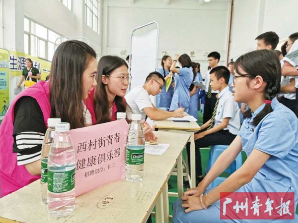 据悉,本次活动是广州市青年文化宫结合广州市教育局关于中学生参加社会实践的倡议,在举办了10多年“聘出精彩暑假”广州大学生专场招聘会积累的经验与资源的基础上举办的。进入校园设摊招聘的有政府部门、事业单位,还有国企、私企、外企等企业单位,涵盖了航空、餐饮、设计、运动、公益等行业。在模拟招聘会现场,同学们根据自己设定的专业和学历,寻找个人感兴趣且专业对口的单位及职位,然后排队参加“面试”。