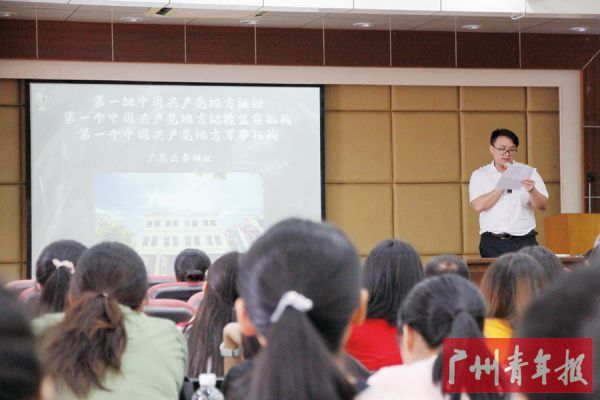 广州市第十中学校园内,矗立“英雄花•英雄城”红色之旅“1+9”里面的其中一个,第一批中国共产党地方组织——中共广东支部的诞生地“广东省立宣传员养成所遗址”(又称“小红楼”),它在党史上具有不可替代的历史价值。当天,由广州市第十中学的历史老师陈满钗在这里宣讲小红楼的历史意义和党的十九大精神,切实体现了青年们对“不忘初心、牢记使命”的理解,对传承和弘扬“红色基因”的历史担当。