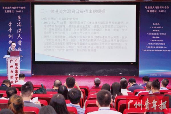 本报讯(记者 胡媛媛 实习记者 陈泽香 摄影 黄宇帆 通讯员 孙慧 冯英子)7月4日,由广州市青年联合会主办,广州市穗港澳青少年研究所承办,广州市青年研究会、广州市天河区海外联谊会、广州市青年就业创业服务中心、广东社会学学会志愿服务研究专业委员会协办的首届“粤港澳大湾区青年合作发展论坛”在广州举行。来自北京、上海、广州、香港、澳门、深圳等地的专家、青年研究工作者100余人参加论坛,围绕“粤港澳大湾区青年创新创业研究”主题,就青年深度参与粤港澳大湾区建设、粤港澳大湾区青年成长发展、粤港澳大湾区青年创新创业新机遇等展开交流与对话,并探讨合作机制,展望未来。