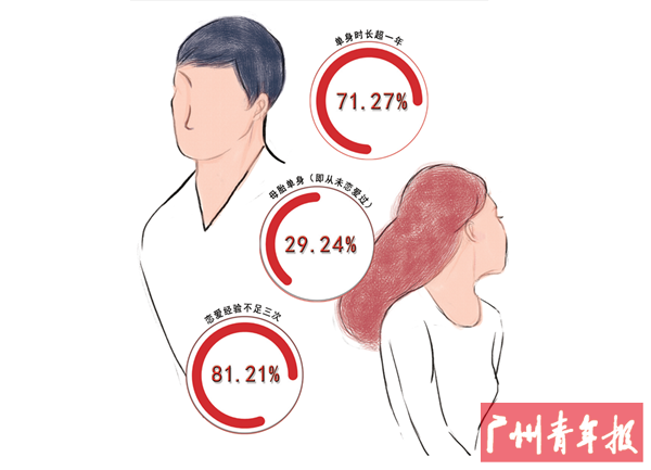 《广东省单身青年婚恋调研报告》显示,七成(71.27%)广东单身男女的单身时长超过1年,而就恋爱经历来看,八成(81.27%)单身男女表示恋爱经历不足3次,更有近三成(29.24%)为母胎单身(即从未恋爱过)。