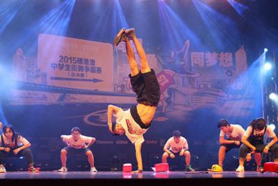 8月15日,由团广州市委指导,广州青年联合会、广州青宫主办,广州青少年时尚创意联盟、YoungStar流行文化基地、广州青年流行舞协会等承办的“2015 穗港澳中学生街舞争霸赛总决赛”在南方剧院引燃“战火”,在穗港澳三个分赛区经层层筛选晋级的 9 支学校代表队齐聚一堂,角逐总决赛桂冠宝座,酷炫上演穗港澳年度中学生街舞巅峰之战。比赛现场,参赛选手们“火力”全开,一个个高难度的动作引爆力量与美感的极致,穿透着强大的舞蹈张力。