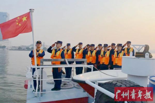 排查辖区火灾隐患、处置突发应急事件、开展消防宣传、落实专人对重点区域的值守。整个国庆假期,海心沙码头都有一艘珠江号消防船,这是广州市消防支队水上中队正在执勤。10月1日凌晨4点半,中队干部就带着他的战友们上船,备战,踏上国庆的保卫之路。10月1日的升旗仪式是在船上举行的,当五星红旗冉冉升起,江边的晨光也慢慢明亮,照映在五星红旗周围的时候,水上中队的队员们表示,当时就觉得,此生不悔入华夏,没有比这更美的景色了,国庆的防火安全,一定得把它守好了!