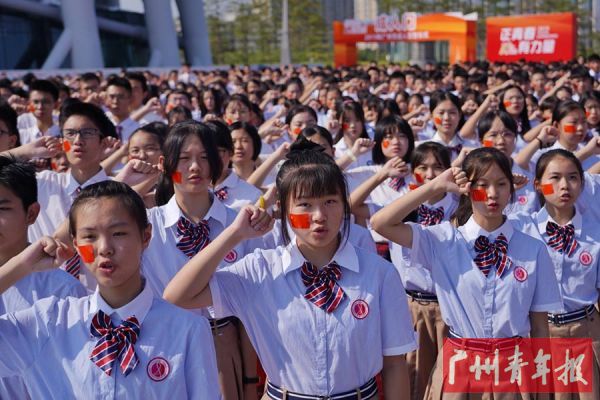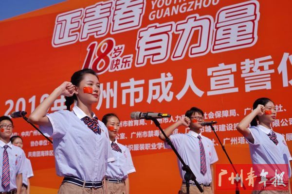 本报讯(记者 吴敏婷 摄影 黄宇帆)10月17日,在第26个“广州成人宣誓日”(10月18日)来临之际,共青团广州市委员会联合市委宣传部、市教育局、市人社局、广州日报社、广州市广播电视台在广州塔隆重举行“弘扬爱国情 青春勇担当”——2019年“18岁青春季”广州市成人宣誓仪式,引导和激励全市18岁青年牢记习近平总书记对新时代中国青年提出的“树立远大理想、热爱伟大祖国、担当时代责任、勇于砥砺奋斗、练就过硬本领、锤炼品德修为”的谆谆教诲,树立正确的世界观、人生观、价值观。
