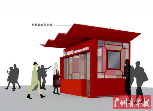 建筑的造型在岭南建筑特色的基础上进行提取,提取满洲窗做成立面,做成岭南建筑的一个小缩影,把古建筑用现代材料表现,碰撞出时代的火花。整个建筑利用装配式的模式,移动方便,维护方便,可重复利用建筑材料,达到利用最大化。屋顶做成可移动的太阳能光板,可以供应一定的电量给驿站用电。当屋顶移出,可作为遮阳板,可以为途人提供一个避阳遮荫的地方。在侧面与背面,设立LED屏幕,播放海报内容,也提供自助咨询的页面,为人们提供更好,更方便的服务。室内主要提供收纳的空间和舒适的工作环境。