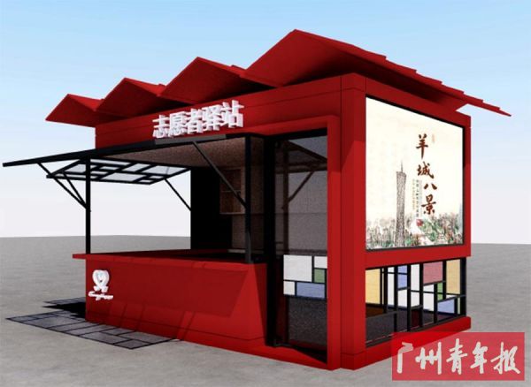 整个建筑的造型融合岭南建筑特色和现代城市风格,在站体侧面与背面,设立LED显示屏,用于播放志愿服务信息和公益广告等内容。站体内设计简洁明了,主要便于志愿者开展志愿服务工作,尽可能地提供更大工作空间。在站体色彩和显示度上,重点体现广州志愿者符号,直接命名志愿驿站,使得站体更具有辨识度。