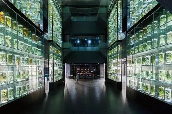 在中国,一般的大学都以图书馆或者主教学楼作为学校的标志,设置在学校中轴线的中央。但在广中医,他们校园中轴线的核心却是广东中医药博物馆。在这个馆中,陈列着各种各样的中药标本浸制药标本,以及各式各样的中医仪器。而其中药标本墙更是高14.8米,很可能是世界上最高的中医药标本墙。