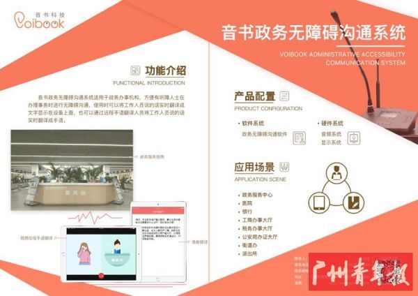 据介绍,广州音书科技有限公司是一家创新型企业,致力于通过“互联网+人工智能”技术改善听障人群的沟通现状,并打造专业的互联网服务平台。公司面向听力服务、言语康复、特殊教育学校、残联、银行、医院等机构提供辅助沟通系统。目前,华为、科大讯飞等行业巨头与音书展开合作。虽然“我们的模式比较简单,语言康复是收费的、识别也是收费的,”但是音书正在以稳健的步伐向前迈进。在2018年,“我们也被评为最具发展的20个潜力企业之一。我和我们的同事今年入围了福布斯30岁以下的精英板。”