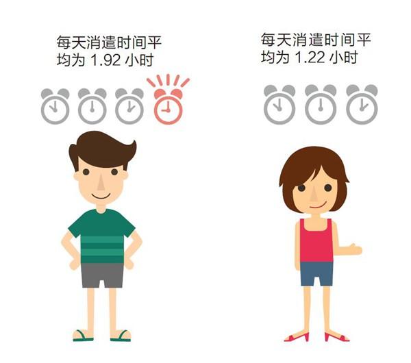 消遣时间上存在性别和年级差异,男生每天的消遣时间平均为1.92小时,而女生只有1.22小时,比男生少42分钟。随着年级每升高一级,每日消遣时间减少0.34小时(约20分钟)。从大一到大四随着年级的升高,手机使用的时间逐渐减少。