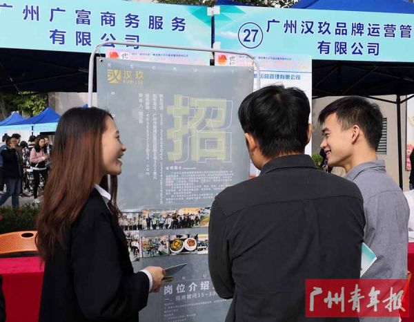 本报讯(记者/摄影 胡媛媛)11月30日,在共青团广州市委员会指导下,广州市青年就业创业服务中心联合广东工程职业技术学院、广州工程技术职业学院、广东生态工程职业学院、广东食品药品职业学院、广东交通职业技术学院、广东省外语艺术职业学院等学校举办“职得一会”2019广州青年人才供需见面会暨“千校万岗”大中专学生就业精准帮扶行动高校毕业生秋季专场招聘会(龙洞地区高校专场)。活动共吸引100家企业,提供近2200个就业岗位,涵盖生物医药、人工智能、物流、教育、汽车、物业、酒店等行业,为用人企业和高校毕业生提供双向选择的人才对接机会。