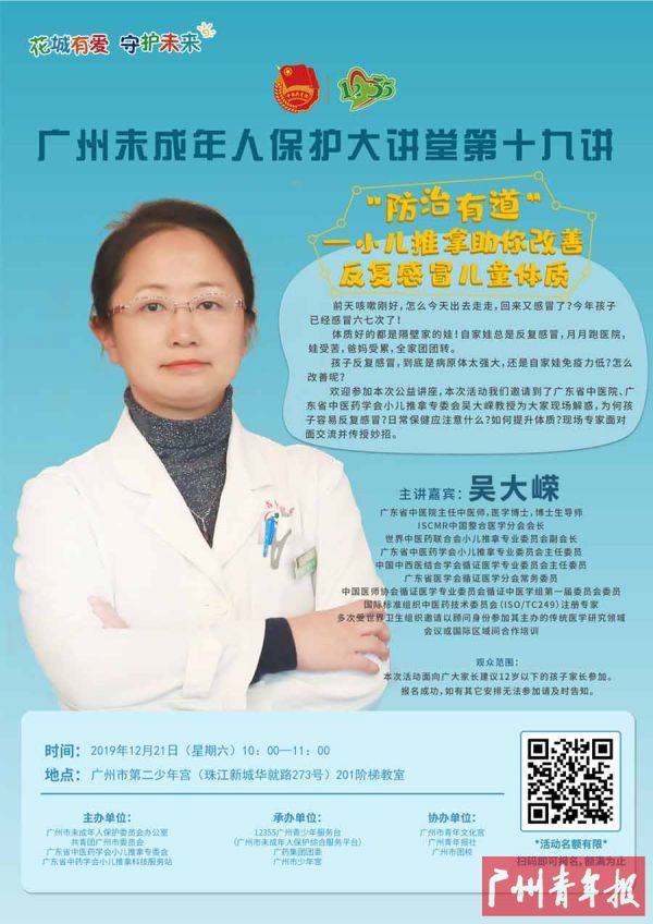 本周六,广州未成年人保护大讲堂(第十九讲)将邀请到广东省中医院主任中医师,医学博士,博士生导师,吴大嵘教授进行《防治有道——小儿推拿助你改善反复感冒儿童体质》主题讲座。当天上午,吴教授将为大家现场解惑:为何孩子容易反复感冒?日常保健应注意什么?如何提升体质?听专家面对面传授妙招,机会难得。12月21日上午10:00~11:00,广州市第二少年宫(珠江新城华就路273号)201阶梯教室,我们约定你咯。