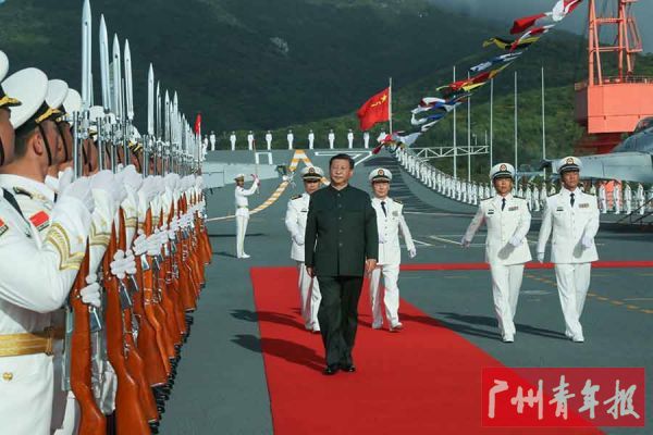 随后,习近平登上山东舰,检阅仪仗队。习近平察看有关装备,了解舰载机飞行员工作生活情况。习近平前往驾驶室,同官兵亲切交流,在航泊日志上郑重签名。
