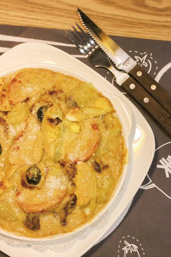 拾忆的主理人是土生土长的澳门人,对于澳式葡国菜就像进自己厨房一样熟悉。以富有澳门特色的“土生菜”—葡国鸡为例,拾忆不同于澳门一般餐厅的做法使用冰鲜鸡,而是选用符合广东人饮食习惯的新鲜鸡肉,结合了葡式的烹饪方法,在鸡中加入鸡蛋和椰香咖喱进炉焗烤,用香浓的咖喱汁将烧鸡的酥皮融化,使咖喱的香气逼入其中,最后撒上椰丝提香。就是在这种中西文化不经意的杂合中。西洋家常菜“白酒煮蚬”也是招牌之选,小厨用葡国进口白葡萄酒加百里香、迷迭香和洋葱闷煮而成,花甲肉浸入了白葡萄酒的果香且酒精的酵素让海鲜肉质变得更加紧实,百里香的香气让菜品整体充满了异域风味。值得一提的是,这道菜最大的特点在于,白葡萄酒由于季节、年份还有葡萄品种等众多因素的不同而有上万种,再加上香料的不同,“白酒煮蚬”的口味也能有成千上万种。