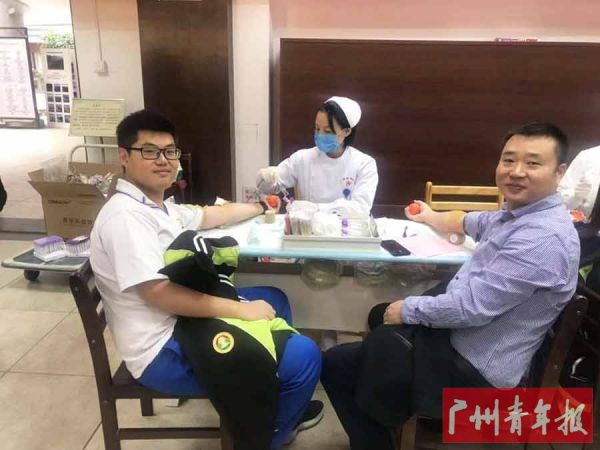 献血当天,各种温馨有爱的场面温暖了整个校园:瞧,当天18岁生日的高三12班苏象龙同学鲜血时听到同学们唱生日歌,得意卖萌;曾均山老师与在校读书的儿子曾文俊同学一起献血(见下图),真的很有默契;还有高三级郑灿伟老师带领其任教班级的学生一起参加无偿献血……