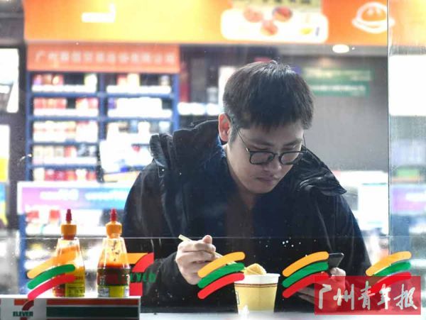 刚下班的Jimmy来到一家7-ELEVEn便利店吃鱼腐,但他最喜欢吃的是关东煮,平时下班之后他都会来这里吃。他觉得6点下班的时间比较尴尬,地铁正值下班高峰期,7点多回到家再做饭又太晚了,所以想先吃点东西填一下肚子再回去,回到家再简单地煮个夜宵。“我觉得这座城市可以给予我很多东西,周边的生活配套设施还是挺完善的,比如就我的专业来说,这里可以提供很多我所需要的资源,可选择的场所还是挺多的。”Jimmy说自己挺喜欢广州这座城市,他觉得在广州生活挺好的,周末的时候可以在家做几个菜、喝点小酒,或者去方所书店看看书,或者出去运动,偶尔再来个短假游,对他来说,这就是最幸福的生活。