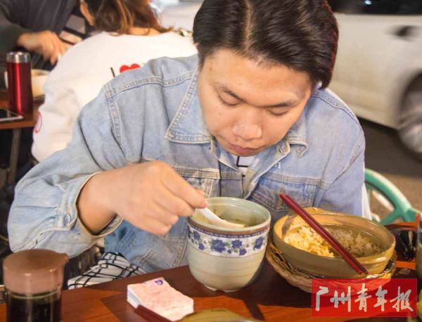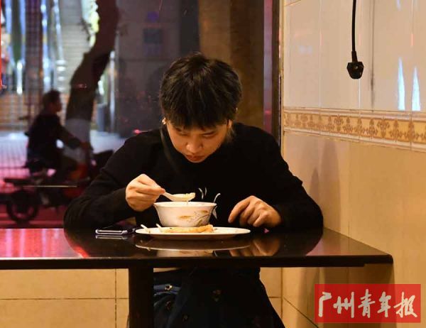 夜里,柯柯正在荔湾区的一家老字号喝艇仔粥。他说,自己每天除了画画就是跑出来吃好吃的,“我把广州所有好吃的地方几乎都跑了一遍。”平日里,他还很喜欢到海珠区的一家潮汕餐馆吃饭。他觉得那里的潮汕菜很正宗,每次吃的时候都有一种回到家乡的感觉,有属于家乡的味道。