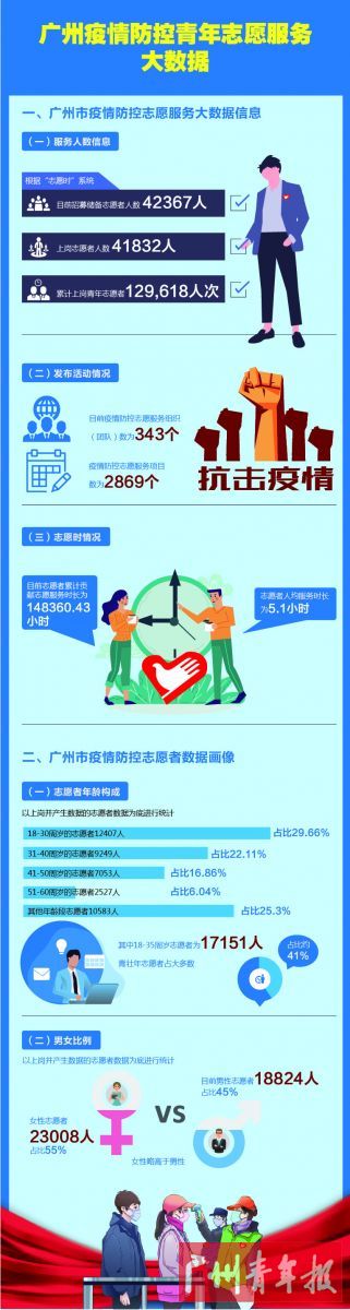 根据“志愿时”系统数据统计,目前招募储备志愿者人数42367人,上岗志愿者人数41832人,根据疫情易传染的特点,团广州市委在前期动员中强调以18岁以上青壮年志愿者为主,数据显示18-35周岁志愿者为17,151人,占比约41%。目前男性志愿者18,824人,占比45%;女性志愿者23,008人,占比55%,女性略高于男性。