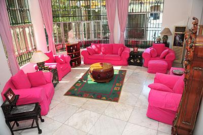 红线女旧居由一栋米白色外墙、粉红屋檐的假三层洋楼和独立花园组成,现在按主人生前原貌布置,由客厅、练功室、书房、主卧等组成。在花园中,一方圆水池蓄满清水,五彩鲤鱼游动其中,天气好的时候,红线女会在院子里吊嗓。走进客厅,这里的摆设维持着红线女生前的模样。洋红色是女姐最爱的颜色,客厅摆放着的沙发,便是满眼洋红。记者看到,住所内保留了大量带有粤剧痕迹的物品:为排练而专门购置的钢琴被安置客厅一角,右手边为练习专门布置的练功厅,多套演出服也悄然陈列。