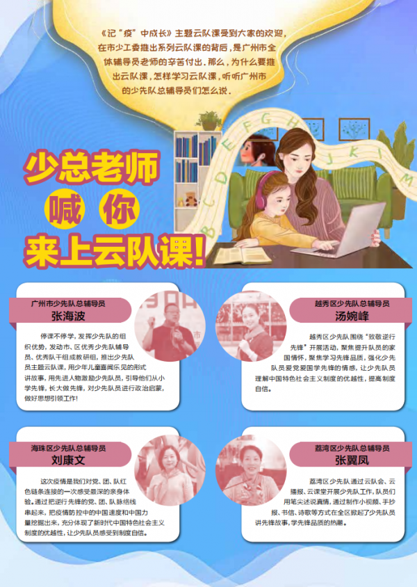 《记“疫”中成长》主题云队课受到大家的欢迎,在市少工委推出系列云队课的背后,是广州市全体辅导员老师的辛苦付出。那么,为什么要推出云队课,怎样学习云队课,听听广州市的少先队总辅导员们怎么说。