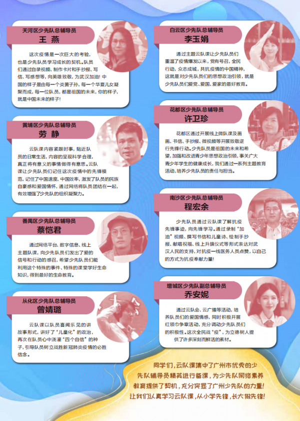 同学们,云队课集中了广州市优秀的少先队辅导员精英进行备课,为少先队网络素养教育提供了契机,充分突显了广州少先队的力量!让我们认真学习云队课,从小学先锋,长大做先锋!