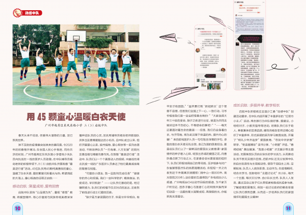 启航中队坚持“以品德为先”,重视“德育”教育,将爱国情怀、核心价值观与民族传统美德深深播种进队员的心灵。区优秀辅导员杨剑老师鼓励队员争当友善博爱豁达的小标兵,自中队成立以来,组织开展爱心义卖、捐书捐物、爱心帮扶等一系列志愿活动,不断培养队员“一方有难、八方支援”的阳光友善品格与博爱向善作风。在致敬“最美逆行者”活动中,队员们以一个个真挚动人的视频,向奋战在湖北抗疫一线的广东医护人员表达了他们最真诚崇高的敬意与祝福。