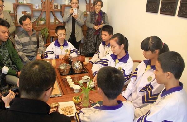 初二级的卢浩章同学,每周三下午的活动时间,都会来到兰亭轩(茶艺室),跟同为初二级的同学们一起品茶香,习茶艺。铁观音要用90°C-95°C的水冲泡才能泡出最好的滋味,喝茶的礼仪十分讲究,要非常周到……他在品茶中学会了淡定处事,也爱上了品茶,回到家都会给爸爸妈妈泡茶喝。在兰亭轩里,除了品茶外,还有毛笔,同学们可以像古代的文人墨客一样挥毫泼墨。