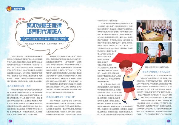 林秋玉校长认为中小学时期是可塑性最强的阶段,是形成健全人格的关键时期。在当前素质教育背景下,海珠区第二实验小学教育集团严格落实立德树人的根本任务,把“人格教育”作为第一教育,着重培养学生的爱与意志。这是推进素质教育,培养社会主义建设者和接班人,促进学校高水平内涵式发展的重要举措,同时有助于学生道德、情感、意志、信念等意识、能力的养成,对于塑造学生的健全人格,引导学生成长为一个独立而强大的人具有重要的意义,为学生的终身发展打下了坚实基础。