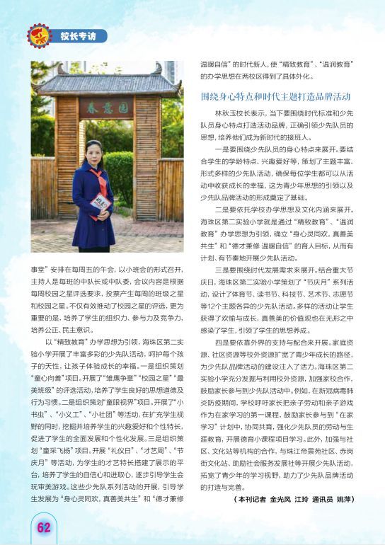二是要依托学校办学思想及文化内涵来展开。海珠区第二实验小学就是通过“精致教育”、“温润教育”办学思想为引领,确立“身心灵同欢,真善美共生”和“德才兼修 温暖自信”的育人目标,从而有计划、有节奏地开展少先队活动。