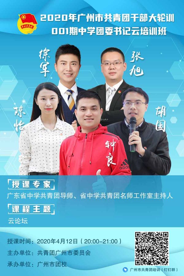 日期:[2020-04-16] 版次:[A06] 版名:[青关注]本报讯(记者 吴敏婷 通讯员 钟良 梅子君 张淑薇)4月12日至14日,由共青团广州市委员会主办、广州市团校承办的“2020年广州市共青团干部大轮训001期中学团委书记云培训班”正式开班!这是全国团校首期团干部“云培训班”,旨在深入学习贯彻习近平总书记重要讲话精神和关于疫情防控的系列重要指示精神,落实广州市共青团干部三年轮训工作计划。来自广州市各级各类中学的200多名团委工作负责人相聚“云”上,共同学习党团知识,分享、探索团队工作的新方法、好方法。