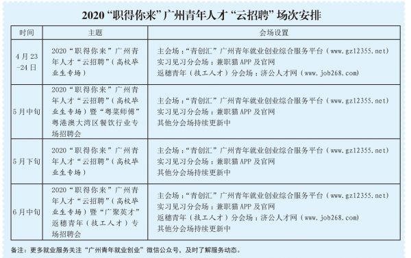 日期:[2020-04-23] 版次:[A08] 版名:[青聚焦]本报讯(记者 胡媛媛 通讯员 曾群杰 郑先统)4月23日至24日,由共青团广州市委员会、广州市人才工作领导办公室共同指导,广州市青年就业创业服务中心联合市总工会人力资源分市场和市妇联人力资源分市场开展的2020“职得你来”广州青年人才“云招聘”(高校毕业生专场)在“青创汇”广州青年就业创业综合服务平台(www.gz12355.net)上线,并同步推出实习见习分会场和行业分会场,为各大企事业用人单位“招兵买马”和青年大学生求职“空中牵线”搭建供需对接平台,吸引了包括广州中国科学院软件应用技术研究所、广百商业地产、广州市人民印刷厂、广州浪奇、广州新城市投资集团、中山大学科技园、微远基因、雪花啤酒、广州数控等逾480家企事业单位参会,通过云平台发布了各类优质岗位,包括物联网学科带头人、智能交通研究员、前端开发工程师、平面设计师、招商专员、项目主管、行政助理、管理培训生、会计等招聘岗位8000多个。值得一提的是,网络主播、网络文案策划(写手)等新兴行业岗位在本次招聘企业中有所需求。岗位上线后,持续招聘不下架,广大高校毕业生可以随时登陆“青创汇”平台注册发布求职简历,在线申请自己心仪的岗位。