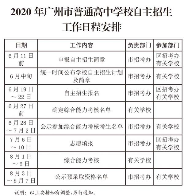 日期:[2020-06-11] 版次:[A07] 版名:[新绿社区]本报讯(记者 吴敏婷 通讯员 穗教宣)近日,广州市教育局印发了关于做好2020年广州市普通高中学校自主招生工作的通知。据悉,今年普通高中学校自主招生政策与去年相比没有变化。8月1日~8月2日,各学校组织综合能力考核。
