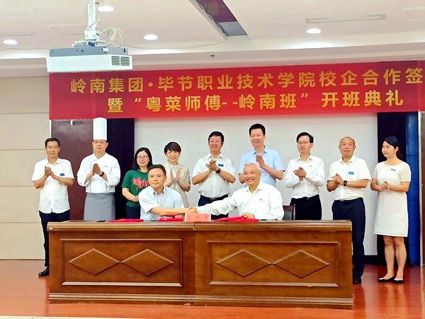 本报讯(记者 胡媛媛)6月29日上午,广州岭南国际企业集团有限公司•毕节职业技术学院校企合作签约暨“粤菜师傅——岭南班”开班典礼在贵州毕节职业技术学院举行,团广州市委副书记叶兴仁,广州岭南国际企业集团副总经理李峰,毕节职业技术学院党委书记龙泽玉和党委副书记、院长池涌等出席,岭南集团旗下南沙花园酒店总经理、国务院特殊津贴餐饮专家龙伟彦为2018级、2019级“粤菜师傅——岭南班”的学员上开班第一课。