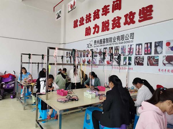 7月21日上午,产业扶贫和消费扶贫调研组走进威宁县扶贫车间——贵州鑫露鞋业有限公司,实地了解建档立卡贫困劳动力在家门口实现就业脱贫的情况。并向该车间加挂牌匾。走进扶贫车间,只见数十名妇女指尖翻飞,忙着编织各色花样的凉鞋。