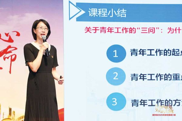 比赛现场,围绕着青年工作的重点与方法,团市委组织部参赛选手、团市委青年理论学习小组成员马艾斯对习近平总书记关于青年工作的重要思想进行了解读,她认为青年工作的重点是做好青年的思想引领,方法是关心、服务、引导青年,为青年提供展现才华、全面发展的平台,助力他们健康成长。精练的授课内容、流畅的演讲、自信的表述,让她收获了热烈的掌声。最终,马艾斯以全场最高分获得了大赛一等奖。来自广州市团校党总支、团市委青年理论学习小组的选手李泽阳,结合自身工作内容,以“号声嘹亮,青春在行动”为主题,生动详细讲述了青年文明号的概念、发展历程、实践活动等相关内容。她希望学员立足岗位、创优奉献,将青年文明号活动推向新的阶段。广州市志愿者行动指导中心党支部的参赛选手,也是团市委2020年新入职的张扬南从苏联解体的案例切入,剖析了当前国内外的时事热点,分析我国当前意识形态工作面临的新挑战和新考验,并认为团员干部要冲锋在前、干在实处、走在前列。来自广州市青年文化宫党总支、团市委青年理论学习小组的张家龙从“是什么”“为什么”“怎么做”三个方面入手,深入浅出地向观众解析“五四”精神。