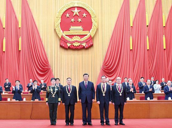 在雄壮的《向祖国英雄致敬》乐曲声中,习近平为国家勋章和国家荣誉称号获得者一一颁授勋章奖章,并同他们亲切握手、表示祝贺。随后,4位国家勋章和国家荣誉称号获得者受邀到主席台就座。全场响起一阵阵热烈的掌声。