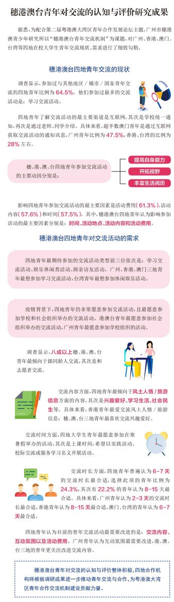 本报讯(记者 梁茹欣 通讯员 麦子云 冯英子 摄影 黄宇帆)9月17日,由广州市青年联合会、广州海外联谊会、广州市推进粤港澳大湾区建设领导小组办公室、广州市人民政府港澳事务办公室、广州市人民政府台湾事务办公室、广州广播电视台共同主办,广州市穗港澳青少年研究所承办的“第二届粤港澳大湾区青年合作发展论坛”在广州举行,来自北京、上海、广州、深圳、香港、澳门、台湾等地的专家、青年研究工作者200余人以线上+线下相结合的方式参加论坛。本届论坛围绕“粤港澳大湾区青少年交流路径与机制”主题,就青年深度参与湾区建设、湾区青年交流工作内容、湾区青年成长发展制度建设等问题展开交流与对话,并探讨提升青年交流工作科学化、专业化水平的有效路径。论坛现场发布了穗港澳台青年对交流的认知与评价研究成果,并设置了粤港澳大湾区青少年交流机制、粤港澳大湾区青年志愿服务发展、粤港澳大湾区青年公益直播发展三个分论坛,就关系湾区青年成长发展的重要问题展开了深入探讨。