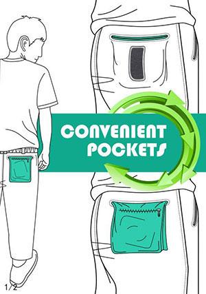平时裤子口袋装很多东西时,坐下或者走路会很不舒服。这个口袋可以将裤袋由暗袋变明袋,设计的拉链可以增加袋子的安全性,上下部分的魔术帖也可以帮助袋子固定。这时的口袋露在外面就解决了问题,让使用者更舒适。