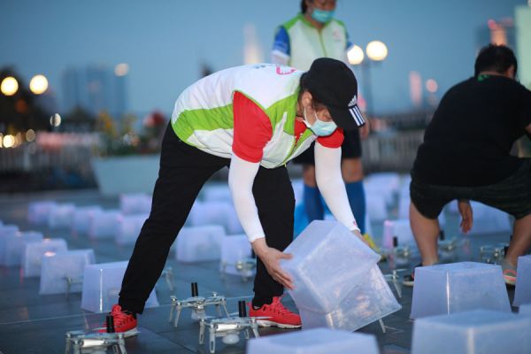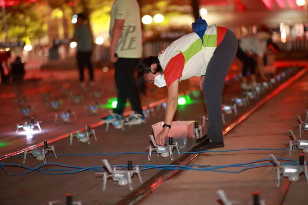 “无人机表演基本都在晚上开展,所以夜幕降临的时候,我们就要协助无人机公司把装着无人机的箱子一个个打开,做好飞前检查,定点摆放,换上电池等。表演结束后,一般都超过12点了,深夜里要把电池换下来,把无人机一台台装回到箱子里。我们都叫自己‘夜行侠’!”志愿者领队“海洋姐”笑道。