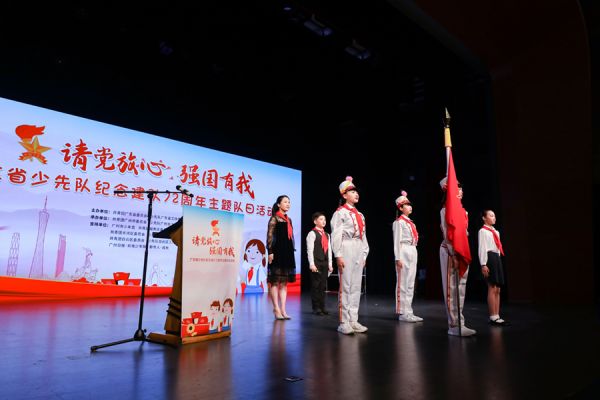 在主题队日活动上,少先队员们庄严迎队旗,相关厅局代表为省文化馆、省立中山图书馆等11个首批少先队校外实践教育营地(基地)授牌。作为我市第一批校外少先队组织试点单位,广州市青年文化宫少工委、广州市少年宫少工委、黄埔区文冲街道少工委、南方报业小记者团(广州)少先队大队从团市委书记、市少工委主任徐柳和市教育局党组成员、副局长、市少工委常务副主任华山鹰同志手中接过了队旗,正式称谓广州市首批试点校外少先队组织,标志着我市迈出了少先队组织创新的重要一步,自此,我市少先队工作组织形成了“校内”+“校外”的领导体系和组织体系。随后,主办方代表共同按下灯柱,启动了首届“广东红领巾文化季”。
