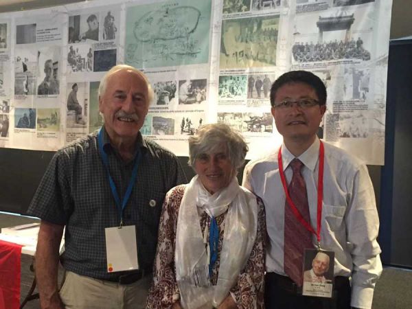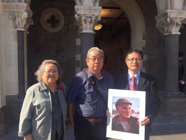 2017年12月,笔者父亲张得渊(右一)同革命先驱邓中夏亲侄、艾黎义子、旅居新西兰著名画家邓邦镇夫妇新西兰合影。笔者父亲手中画作为邓邦镇创作的《艾黎在甘肃山丹》。