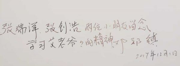 艾黎老爷爷逝世后,只要是他的纪念活动,爸爸陪爷爷奶奶一定都会参加。2017年是他诞辰120周年、来华90周年、逝世30周年,也是中国新西兰两国建交45周年,中新双方举行了隆重的系列纪念活动。当时爷爷90岁而奶奶已去世7年了,爸爸代表我们一家去新西兰参加了系列纪念活动,见到了时任新西兰总督雷迪女爵士、多位相关政府市长和他所有新西兰的亲属好友。特别是爸爸还见到了他的义子、旅居新西兰著名画家邓邦镇(革命先驱、马克思主义理论家、工人运动领袖、中共三大代表邓中夏烈士的侄子)。他把一幅画作《艾黎在甘肃山丹》,送给我和出生不久的弟弟,并在此画后面亲笔为我和弟弟写下了寄语: “张瑞洋、张钊浩两位小朋友留念,学习艾黎老爷爷的精神。邓邦镇2017年12月1日”。我想我和弟弟不仅要学习艾黎老爷爷的精神,还要传承发扬他的精神,努力学习,接续走好我们这一代人新的长征路,把我们的祖国建设的更加繁荣富强。艾黎老爷爷虽然离开我们34年,但他永远活在我们心中。