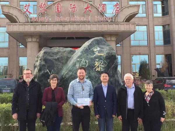 2018年9月笔者父亲张得渊(右三)专程回甘肃与艾黎家乡新西兰塞尔温区萨姆·布劳顿市长(左三)率领的市长代表团一行共叙艾黎情。