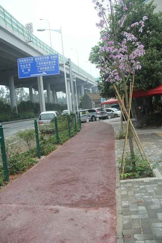 2015年2月,新年未到,大学城确已在冬日中悄然变样。不仅脱去了亚运时遗留的铁皮围墙。更将中环路的6车道中腾出2车道给行人和自行车,并环绕自留村修建自行车专用胶道。现在在中环、内环和若干条规定放射线道路上设置自行车专用道,与外环自行车道联接成网,构成大学城慢行系统。此次项目建设总长度约为22.3公里的绿道,其中包括中环路的11公里,和其他9条放射线道路11.3公里,为上下行双向进行改造。