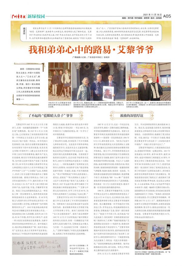 11月18日,本报A05版刊发广青融媒小记者、广东实验中学初二张瑞洋同学撰写的追寻文章《我和弟弟心中的路易·艾黎爷爷》,从小记者的视角,讲述家人和“中国十大国际友人”之一、新西兰著名社会活动家路易·艾黎几十年深情厚谊的故事。文章开头就说“我们一家从曾祖父开始,同艾黎老爷爷有着三代人的深厚友情,他常常出现在爷爷奶奶和爸爸的故事里……”,然后追寻路易·艾黎在中国共产党成立早期、抗日战争、新中国成立到改革开放不同时期在中国的足迹,展现了这位伟大的国际主义战士为我国发展和世界和平做出的卓越贡献。文中还生动还原了小作者爸爸张得渊两次见到艾黎老爷爷的情景,再现了这位将一生都献给中国的国际友人对中国人民的深厚感情。最后小作者说:“我想我和弟弟不仅要学习艾黎老爷爷的精神,还要传承发扬他的精神,努力学习,接续走好我们这一代人新的长征路,把我们的祖国建设得更加繁荣富强。艾黎老爷爷虽然离开我们34年了,但他永远活在我们心中。”表达了当代少年儿童对革命前辈的敬仰和怀念。