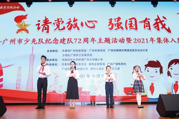 10月13日是中国少年先锋队建队72周年纪念日。也是《中共中央关于全面加强新时代少先队工作的意见》出台后的首个少先队建队纪念日。为学习宣传贯彻习近平总书记“七一”重要讲话精神,贯彻落实习近平总书记关于少年儿童和少先队工作的重要论述,全面落实少先队社会化的要求,团市委等单位联合举办的“请党放心,强国有我”——广州少先队纪念建队72周年主题活动暨2021年集体入队仪式,在主会场华南师范大学附属大学城小学和各区的线上直播分会场启动,现场少先队代表和全市115万名少先队员以线上和线下的方式共同参加集体入队仪式,通过庄严的仪式、丰富的校外实践,引导少先队员坚定理想信念、厚植爱国情怀、传承红色基因,让少先队员们度过了一个既受到启迪教育、又留下美好印象的节日,进一步引导少先队员听党的话、跟党走,从小学先锋、长大做先锋,努力成长为能够担当民族复兴大任的时代新人。