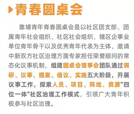 青春圆桌会是黄埔区开展社区青春行动的创新尝试,青春圆桌会以社区团干、社区青年居民、属地高校学生、属地中小学团队干、驻地企业职工骨干、驻地社会组织青年人才等各领域优秀青年为主体,邀请中新双方社区治理方面专家担任荣誉顾问,组建圆桌会理事会,通过调研、议事、提案、倡议、实施五大环节,搭建常态化议事机制,引领广大青年积极参与社区事务。